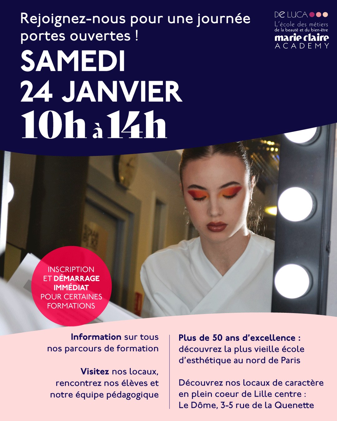 • Pour assister à des démonstrations : assistez à des démonstrations en direct où nos étudiants dévoileront leur talent. Découvrez l’art du soin, du maquillage et du spa avec des présentations dynamiques.